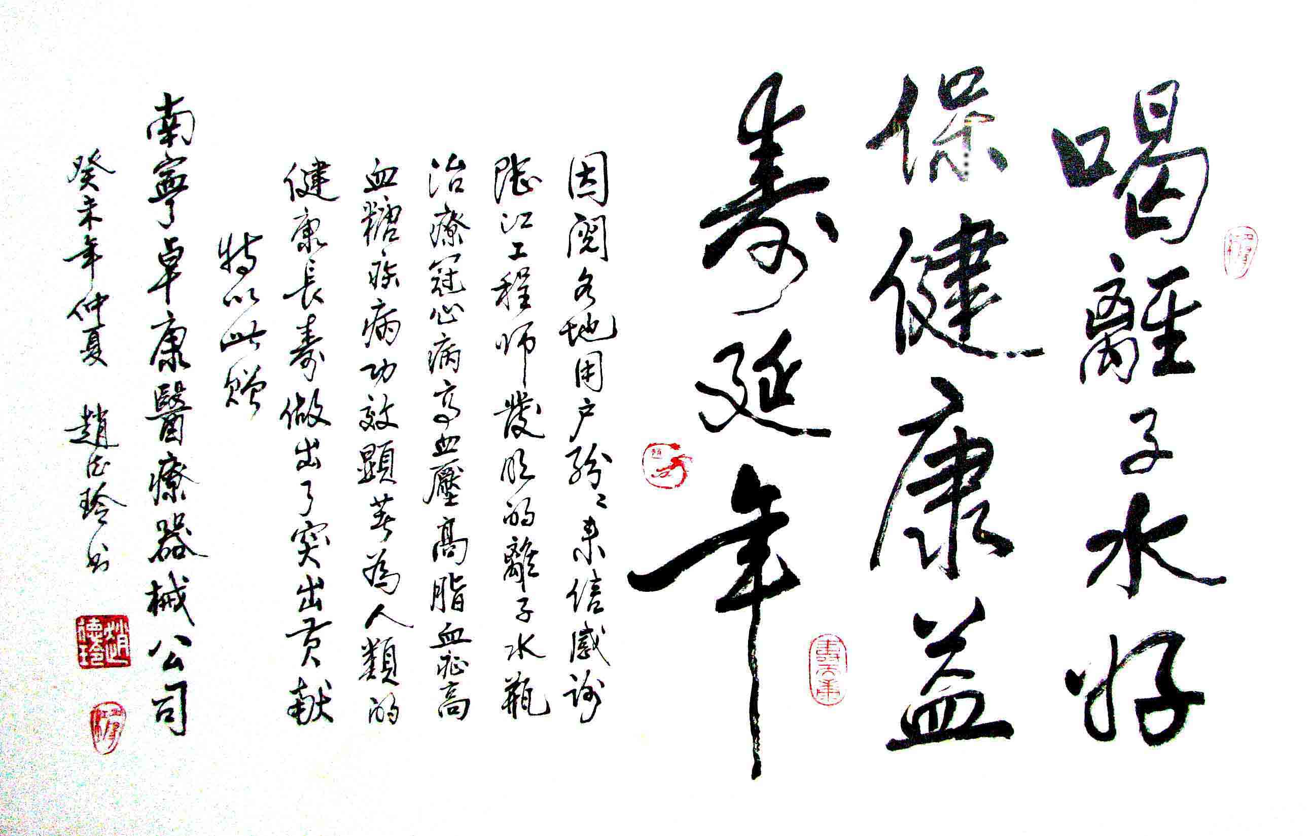 -----我是從事建筑的高工,本來沒有資格去攻克醫學難題,卻為了自身健康才扣響醫學的大門。由于我1990年患高血壓,因怕中風才研究發明了離子水瓶,我把水處理成微小分子團水,飲用后治愈了高血壓。便于1993年底送到三家省級醫院做臨床試用4個月。經北京和廣西醫學專家鑒定:"降脂降壓效果好"," 能擴大心腦動脈流量,改善心腦電圖以及微循環","對治療心腦動脈粥樣硬化、高血壓、高血脂有良好的醫療保健作用。""產品的技術性能和療效達到了同類產品的國內領先水平,經廣西醫學科學情報研究所檢索,未見國外有類似報道。"中國醫學科學院張正國教授從美國國立醫學圖書館數據庫存Medline檢索英俄文資料,均未見類似報告。2000年上市后,我為了對消費者負責而繼續觀察研究,一直通過《信譽卡》和《質量跟蹤調查書》向患者承諾療效,請用戶使用6個月后反饋效果。和脂壓患者飲用2至5個月內,消除癥狀,停服藥物,血壓正常;冠心病患者飲用3~5個月逐漸減輕至消除心絞痛、房顫等癥狀,不再服藥,飲用1年左右心電圖正常,經冠脈造影掃描無明顯狹窄,表明冠心病痊愈。大量患者還反映許多衰弱器官被修復,讓前列腺增生、慢性咽喉炎、慢性氣管炎、支氣管炎、慢性胃炎、腸炎和膽囊炎等不藥而愈;2型糖尿病患者是因為胰島衰弱致病,飲用該水半年至一年,逐漸減藥至停藥,血糖尿糖正常,真正治愈2型糖尿病。中風后遺癥患者飲用六七個月,可逐漸減輕至消除肢體和語言障礙,表明飲用該水能讓壽命很長的神經元細胞逐漸修復,奇跡般地恢復肢體和語言功能。飲用后還使胸腺和脾臟兩個重要的免疫器官被修復和增強,產生免疫細胞多,提高了免疫力,使人不生病或少生病。自此, 飲用微小分子團水創造了攻克冠心病、高(低)血壓和糖尿病三大醫學難題的奇跡。人們對此感到不可思議,但實踐是檢驗真理的唯一標準。